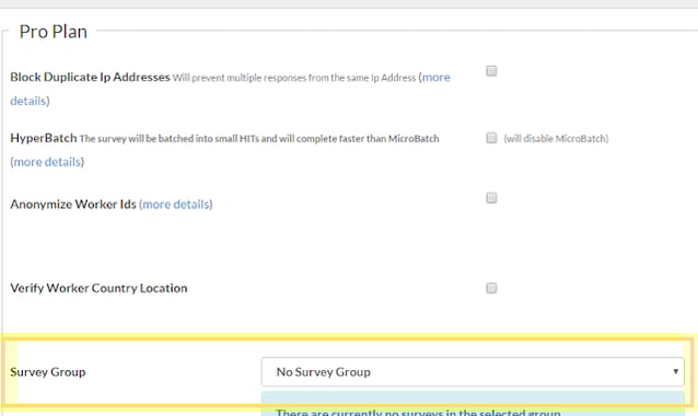 The Survey Group option is also a broader exclusion criteria than the standard Exclude Worker option. While the standard Exclude Worker option excludes workers who have accepted and completed your study, the Survey Group feature excludes any worker who accepts a HIT from one of your studies even if they do not complete the study (e.g., the worker quits halfway through or completes the study but has a technical glitch that prevents them from submitting the HIT).